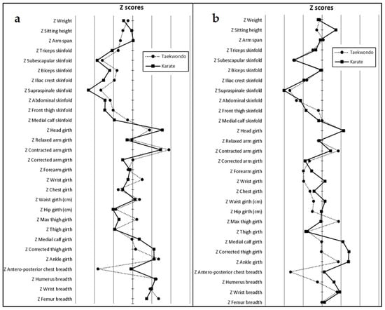 Figure 1 shows the anthropometric Z-Scores of males and females according to discipline. Boys exhibited lower skinfold thickness and breadths than the normal population in both karate and taekwondo. Similarly, the analysis of proportionality in girls revealed lower skinfolds and girths in the lower body, especially in karate players.