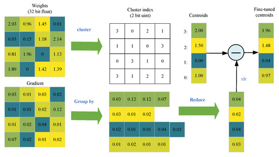 Model quantification came into interest in the 2010s. Model quantization can convert the floating-point algorithm of the neural network model into fixed-point numbers, and taking 8-bit quantization as an example, the 32-bit floating-point number model can be compressed by 75% without reducing the model accuracy [34]. Quantization can effectively accelerate model inference and is important for model deployment. Rastegari et al. [35] approximated and simplified the model weights by binary representation of CNN model weights, and achieved comparable accuracy with standard networks in ImageNet classification while reducing floating-point number operations. Han et al. [31] proposed a three-stage model compression method in the technology of the predecessor technique: pruning, training quantization, and Hoffman coding, which reduced the number of model weight parameters by tens of times. In the network quantization and weight sharing section, the network model is compressed by reducing the number of bits required for weights. Their method reduces the total number of weights by connecting the same weights and fine-tuning the weights being shared. The matrices in the upper left and lower right corners of Figure 2 represent the weight matrix and gradient matrix, respectively, and the four colors green, light green, yellow, and dark blue represent four different bins where the weights are quantified, and they share the same values for the weights of the same bins. At the time of update, all gradients are added in groups by bin, then multiplied by the learning rate (lr) and subtracted from the last shared centroid. This allows the COTV layer in the model to be quantized by 8 bits, reducing memory while maintaining accuracy. Courbariaux et al. [36] proposed a training quantization method for binary networks, quantized the BinaryConnect activation value to 1 bit, and replaced addition and multiplication operations with bitwise operations, which effectively reduced the memory consumption of memory. In 2022, Wang et al. [37] proposed a quantitative improvement strategy based on learnable lookup tables (LLT), which greatly reduced the computational cost by converting quantification into a lookup process.