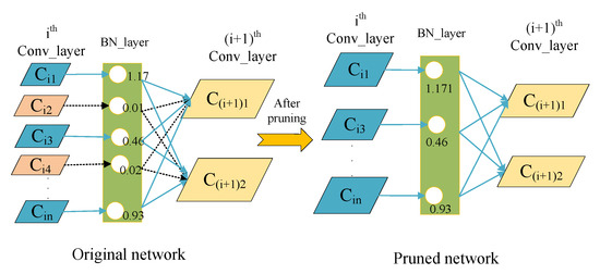 where represents the mean of the input feature x, represents the variance, represents the bias, and represents the trainable scale factor. During training, is used to distinguish between important and non-important channels of the YOLOv4-MobileNetv3 network model. After selecting the pruning rate, non-critical channels are pruned, as shown in Figure 6. Channel sparsity training is performed by using L1 regularization on ; sparsity training loss is shown in Equations (9) and (10).