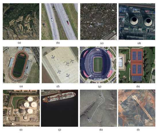 DIOR dataset image example: (a) golffield; (b) vehicle; (c) trainstation; (d) chimney; (e) groundtrackfield; (f) airplane; (g) stadium; (h) tenniscourt; (i) storage tank; (j) ship; (k) windmill; (l) airport.