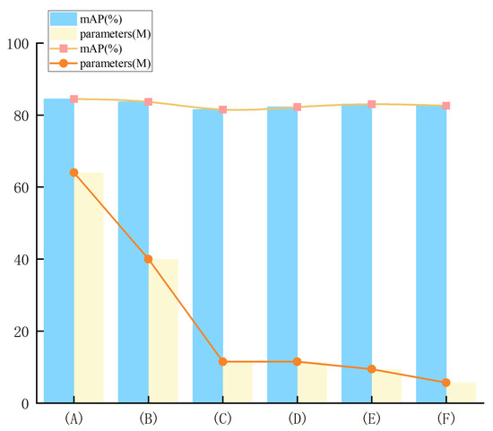 Ablation experiment: parameters and mAP changes. (A) YOLOv4 original network model; (B) model using MobileNetv3 feature extraction network without depth-wise separable convolution modules; (C) model using MobileNetv3 feature extraction network with depth-wise separable convolution modules; (D) model after data augmentation; (E) model after channel pruning; (F) model after quantization.
