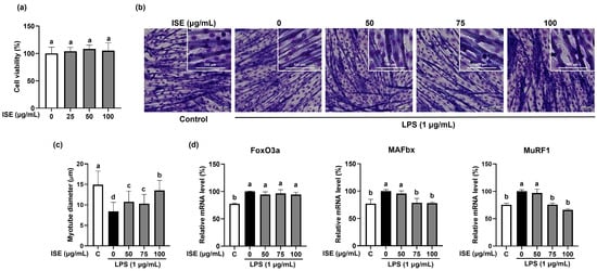 Inhibitory effects of ISE on muscle atrophy in LPS-induced C2C12 myotubes. C2C12 myotubes were treated with LPS (1 µg/mL) and ISE (50, 75, and 100 µg/mL) for 48 h. (a) Cell viability of ISE in C2C12 myotubes. C2C12 myotubes were treated with 0–100 µg/mL of ISE to measure the cell viability. (b) Giemsa staining was performed to visualize C2C12 myotube morphology (magnification 20×, scale bar = 100 μm). (c) Myotube diameters (μm) were observed from randomly selected fields and were quantified using the ImageJ program. The mRNA expression of (d) FoxO3a, MAFbx, and MuRF1 was analyzed by RT-PCR. GAPDH was used as internal controls. Bars with a different letter are significantly different from the control (p < 0.05).