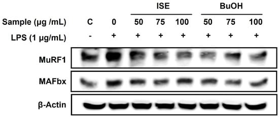 Effects of ISE and BuOH on the protein expression of muscle-specific E3 ubiquitin ligases in LPS-induced C2C12 myotubes. C2C12 myotubes were treated with LPS (1 µg/mL) and ISE or BuOH fraction of ISE (50, 75, and 100 µg/mL) for 48 h. The protein expression of MAFbx and MuRF1 was analyzed using Western blot analysis. β-Actin was employed as a loading control.