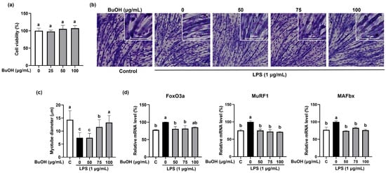 As the BuOH fraction showed the highest TPC and total antioxidant capacity among the five fractions from ISE, we further confirmed the effect of the BuOH fraction on muscle atrophy in LPS-induced C2C12 myotubes. We measured the cell viability of the BuOH fraction in C2C12 myotubes and found that more than 95% of cells were viable when treated with 0–100 µg/mL of BuOH fraction (Figure 3a). Reduced myotube diameter by LPS was significantly increased by the BuOH fraction at 75 and 100 µg/mL (Figure 3b,c). The diameter of LPS-treated myotubes was reduced by 63.6% compared to the control (LPS-untreated myotubes), while 75 and 100 µg/mL of the BuOH fraction increased by 43.5% and 56.5%, respectively, compared to the LPS-treated myotubes. The gene expression levels of FoxO3α, MAFbx, and MuRF1 were significantly increased by LPS, and were significantly reduced by the BuOH fraction (Figure 3d). Furthermore, LPS-stimulated protein expression levels of MAFbx and MuRF1 were noticeably attenuated by the BuOH fraction (Figure 2).