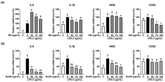 Effects of ISE and the BuOH fraction of ISE on the expression of pro-inflammatory cytokines and inflammation-inducible enzymes in LPS-treated C2C12 myotubes. C2C12 myotubes were treated with LPS (1 µg/mL) and the (a) ISE or (b) BuOH fraction of ISE (50, 75, and 100 µg/mL) for 24 h. The mRNA expression of IL-6, IL-1β, iNOS, and COX2 was determined using RT-PCR. GAPDH was used as the internal controls. Bars with a different letter are significantly different from the control (p < 0.05).