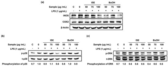 Effects of ISE and BuOH on the protein expression of inflammation-inducible enzymes and phosphorylation of p38 and ERK in LPS-induced C2C12 myotubes. C2C12 myotubes were treated with LPS (1 µg/mL) and ISE, or the BuOH fraction of ISE (50, 75, and 100 µg/mL) for 24 h. (a) The protein expression of iNOS and COX2 was analyzed by Western blot analysis. β-Actin was employed as a loading control. (b) The protein expression of p-p38 and t-p38 was analyzed by Western blot analysis. Phosphorylation p38 was calculated as a ratio of p-p38/t-p38 and expressed relative to LPS. (c) The protein expression of p-ERK and t-ERK was analyzed by Western blot analysis. Phosphorylation ERK was calculated as a ratio of p-ERK/t-ERK and expressed relative to LPS.