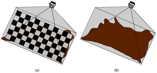 Image (a) shows a chessboard pattern over the material. The chessboard should cover most of the material for the best calibration. In image (b), the camera captures the material for the nesting process.