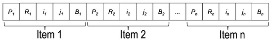 Item coding contains all the items of the nesting. Each item is represented by five alleles: identifier (), rotation angle (), position in rows and columns within the material (,), and packing item ().