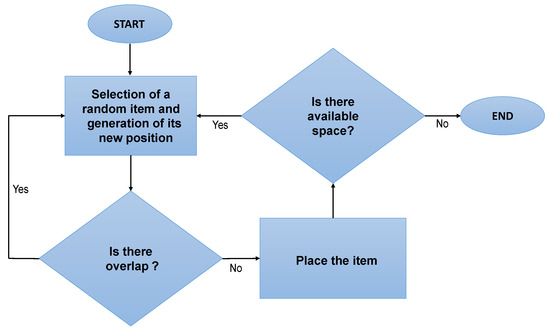 Flow diagram of the greedy sequential algorithm to fill the area of the unused material. The random item is selected, and its position is generated. If the item is non-overlapped with another one, it is placed. The process is looped while there is available space in the material.