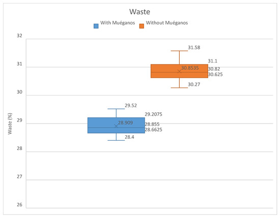 Comparison of waste between the results obtained with and without muéganos. The blue box-and-whisker plot shows a better improvement of the waste over the non-muéganos box-and-whisker plot. The mean of the results using muéganos is around .