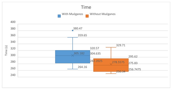 Comparison of time between the results obtained with and without muéganos. The blue box-and-whisker plot shows a greater spread of computational time cost, and the mean of the results is around 305 s due to the size of the muéganos structure. However, it is compensated by reduced waste.