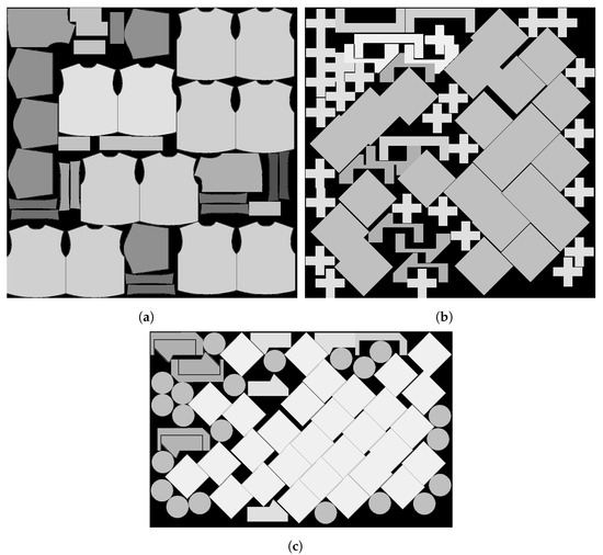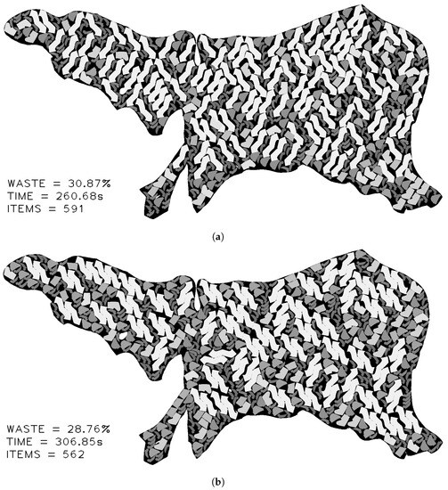 Nesting results obtained (a) without muéganos, and (b) with muéganos. The result obtained from muéganos and item nesting generates less waste than the non-muéganos solution due to the minimum separation between items inside the muéganos structure.