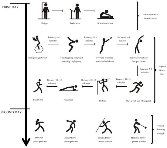 The study recruited youth throwers of different ages (14–18 years) and genders. A series of standardized measurements and tests were conducted. Given the number of participants, the testing was conducted in batches, and all tests were concluded before the end of September 2022. The tests commenced at 9 AM. The first day included anthropometric and physical fitness tests, while the second day focused on specific throwing strength tests (Figure 1). All subjects received standardized training and explanations prior to the test. The measurements and tests were conducted by the same group of individuals, comprising over 20 individuals with backgrounds in sports science and coaching. Conducting pre-testing training for experimenters to standardize the testing procedures. The same group of experimenters conducted each test on athletes to ensure measurement consistency. All subjects followed the prescribed warm-up procedure, which included jogging, dynamic stretching, activation, and potentiation techniques [20]. On the first day, in the morning, all participants underwent anthropometric measurements, followed by physical fitness testing in the afternoon. The tests were conducted in the order indicated in Figure 1, ensuring that the completion of one test did not adversely affect performance in subsequent tests [21]. On the second morning, specialized throwing strength testing was conducted. We documented the results of all participant tests according to the specified requirements of each test.