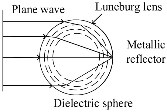 The Luneberg lens reflector is a passive reflector made by coating a layer of metal reflector on the surface of a Luneberg ball according to the principle of light reflection and refraction in a passive medium [15,16]. The ideal Luneberg lens reflector is a mirror-symmetric spherical structure that has a continuous gradient of permittivity along the radius of the ball. The permittivity of the Luneberg ball changes from 2 in the center to 1 on its surface. The relative permittivity of the outermost medium of the reflector is the same as or close to that of air. The reflector has a refractive index of 1.414 at the center of the sphere and gradually decreases to 1 at its outermost layer.