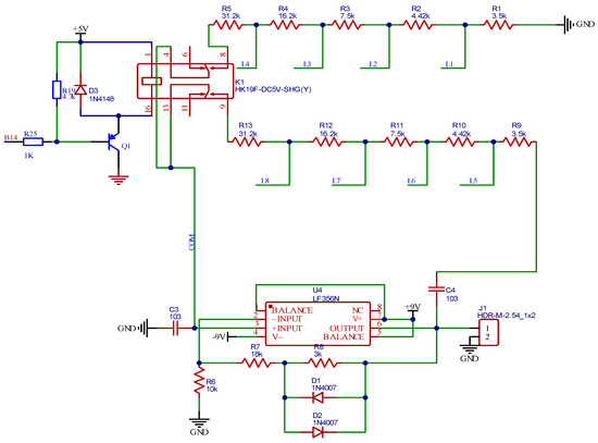 To evaluate the performance of the Doppler frequency simulator, a 10 GHz frequency test system is designed for experimental verification, as shown in Figure 6. A speed of 0–200 km/h is simulated, divided into six levels: 0 km/h, 12.5 km/h, 25 km/h, 50 km/h, 100 km/h and 200 km/h. According to Equation (6), the corresponding analog frequencies can be calculated at 0, 230 Hz, 460 Hz, 925 Hz, 1.96 kHz, and 4 kHz. The voltage of the 4 kHz oscillation circuit is ±9 V, R1 and R2 are equal to 62.82 kΩ, C3 and C4 are equal to 0.01 μF, R7 is 18 kΩ, R4 is 10 kΩ and R8 is equal to 3 kΩ. The two diodes constitute a nonlinear network, which can render the amplifier of the circuit stable over 3 repetitions [28]. This prevents the distortion of the output waveform and ensures its stability. The opamp uses LF356n. Since it is a single-stage common emitter amplifier circuit, the output voltages of the transistor and are 180° in phase. When the output voltage passes through the RC network, it becomes the feedback voltage, and then sends this to the input end. L1-L8 are eight LED lights, and the communication status of the communication interface is determined by the blinking of the LED lights.