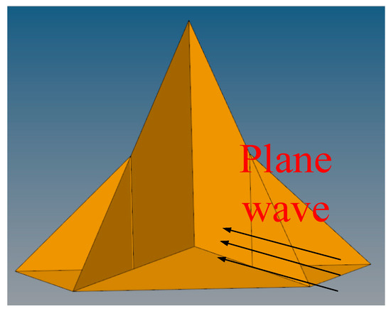 The incident wave may be reflected zero to three times inside the corner reflector, and only three reflected echoes will return to the radar receiver along the path of the original incident direction. Thus, three reflections within a large angular range form the main contributing source of the corner reflector RCS, while up to two reflections can be ignored when calculating the monostatic RCS. The ability of the incident wave to be reflected three times depends on the mutual determination of the incident point P and the incident direction. When a plane wave is at an infinite position, all three reflected echoes have equal phases. Therefore, when the RCS value is calculated using the PO method, an angular reflector can be equivalent to a plane of some dimension through the vertex and orthogonal to the direction of incident, which is the “equivalent aperture”. The incident direction of the electromagnetic wave . Figure 1 shows the schematic diagram of the triple-bounce of the corner reflector.