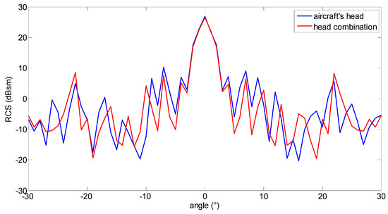 As Figure 12 shows, the RCS distribution characteristics of the assembly have an error of about 0.05 dBsm at the maximum RCS of 0° compared with the distribution characteristics of the head, which fulfills the requirements. Meanwhile, the sharp angle range of −3°~3° is also consistent.