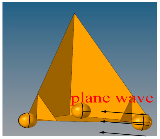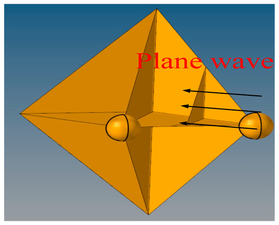 The wing assembly is mainly composed of a tetrahedral variant assembly with a side length of 780 mm and two metal balls with a diameter of 192 mm. These balls are mainly used to reduce the edge diffraction of the corner reflector. The scanning angle range is as follows: azimuth dimension −90°~90°, pitch dimension 0°, angle scanning interval 1°. Figure 9 and Figure 10 show the composite simulation model and the RCS distribution characteristics, respectively.