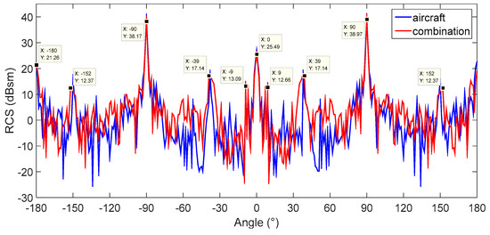 Figure 15 shows the test results. It can be observed that when the simulated target drone is placed horizontally at the frequency of 10 GHz, the peak RCS values appear around −180°, −152°, −90°, −39°, −9°, 0°, 9°, 39°, 90° and 152°. The RCS values at −180°, −152°, −90°, −39° and −9° are 21.26 dBsm, 12.37 dBsm, 38.17 dBsm, 17.14 dBsm and 13.09 dBsm, respectively. The RCS values at 0°, 9°, 39°, 90° and 152° are 25.49 dBsm, 12.66 dBsm, 17.14 dBsm, 38.97 dBsm and 12.37 dBsm, respectively. The RCS value at 0° is 1.39 dBsm compared with the corresponding actual value of an aircraft, and the RCS values at other peaks also decreases within 3 dBsm of the aircraft. The test results show that the assessment index of less than 3 dBsm test error is satisfied. Equation (18) shows that the fidelity score is 93.1 points, which indicates a very realistic level and high performance of the simulation, according to Table 1. When the vector network analyzer is measuring, there will be a fluctuation of ±1 dB, which is a systematic error. Therefore, at the position of the symmetric angle, the RCS value will include a certain test error, but as long as it does not exceed 1 dB, the test result can be proven to be correct.