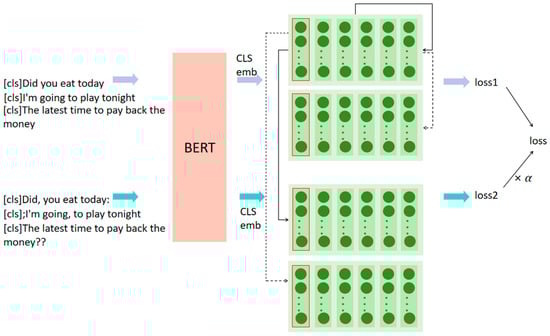 Here, the is calculated as shown in Equation (1), where represents the loss calculated by using the original SimCSE and represents the loss calculated by using the EdaCSE algorithm. Both of them are calculated in the same way, but the latter calculates the loss by constructing comparative learning between the simple data-augmented samples and the original samples as positive example pairs.