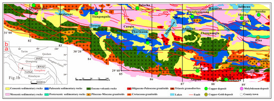 The western part of the Gangdese belt is located in the south-central part of Tibet. The tectonic structure belongs to the Gangdese-Nyainqentanglha landmass in the Gangdese-Himalayan tectonic area, which is between the Yarlung Zangbo River and the Bangong Lake-Nujiang Belt []. The basement consists of the Nyainqentanglha group from Presinian. The Cambrian and low-middle Triassic strata are generally absent, with more complete development observed in the Ordovician stratigraphy. The Ordovician-Permian strata are mainly distributed in the northern part of the study area, and the Upper Triassic-Jurassic strata are distributed in the northern part of the study area, while the Cretaceous-Neogene strata are distributed in the whole area (Figure 1). The region exhibits a significant presence of magmatic rocks, characterized by extensive chronological distribution, large exposed areas, wide distribution ranges, complex origins, and diverse types. The intrusive and volcanic rocks have been extensively developed since the Triassic, mainly formed in the Cretaceous-Paleogene, with the latest volcanic magma activity in the Miocene. Pan et al. [] classified the tectonic unit of the Gangdese orogenic belt. By comparing these tectonic units, the study area can be divided into four magmatic belts consisting of intermediate-acidic magmatic rocks, including South Gangdese, Longgeer-Nyainqentanglha, Ze long, and Ban-Bengcuo. These four magmatic belts are closely associated with the distribution of the porphyry copper-molybdenum-gold deposits. The porphyry copper polymetallic deposits in the study area are mainly distributed in the Gangdese magmatic arc, including Zhunuo, Jiru, Xiongcun, Dongga, etc. Additionally, deposits can be found in the uplifted area of the Longgeer-Nanmulin arc-back belt, which includes Ria in Cuoqin, as well as in the island arc belt of Cuoqin-Xainza, consisting of Balazha, Gaerqiong, and others. The detailed chronology and tectonic setting of the typical porphyry deposits mentioned above have been studied by many authors. The results suggest that the formation environment and metallogenic characteristics of the porphyry deposits in this area are formed in three tectonic settings: island arcs, syn-collisional environments, and post-collisional extensional environments, occurring during four metallogenic periods: the Early Middle Jurassic, Late Cretaceous, Eocene, and Miocen. The porphyry deposits in island arcs such as Dongga and Xiongcun are only distributed in the south of the southern margin of the Gangdese magmatic arc zone. The porphyry deposits in syn-collisional and post-collisional extensional environments such as Zhunuo and Jiru are mainly distributed in the southern Gangdese magmatic arc. Additionally, a few porphyry deposits, such as Balazha and Gaerqiong, are distributed in the northern part of the Cuoqin-Xainza Island arc and the Bangor magmatic arc belt. All these insights greatly extend the geochemical prospecting of porphyry copper polymetallic ore in the western Gangdese.
