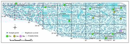 Based on the original geochemical data, this paper is under the guidance of the study of geological laws, the establishment of geochemical markers, and the exploration of geochemical models (supergene). According to the porphyry deposits in the Gangdese metallogenic belt, part of the geochemical elements combined statistically have been found to be elements of the porphyry copper deposits in combination with Cu, Mo, Au, Ag, W, and Bi, which is convenient to distinguish from other types of ore deposits (Table 3).