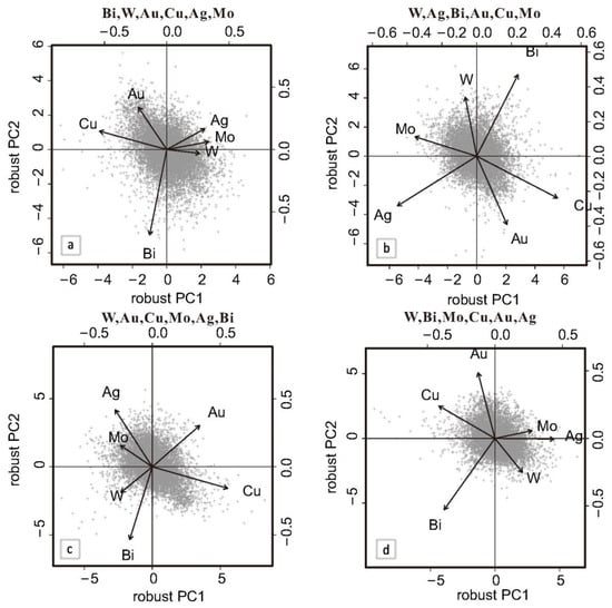 Biplots of different elements in sequence ((a): Bi, W, Au, Cu, Ag, Mo; (b): W, Ag, Bi, Au, Cu, Mo; (c): W, Au, Cu, Mo, Ag, Bi; (d): W, Bi, Mo, Cu, Au, Ag).