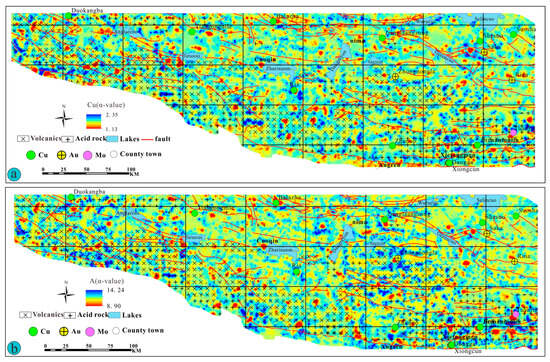 (a) Anomaly map of singular values of copper elements; (b) singular value anomaly map of porphyry copper deposit geochemical composition element.