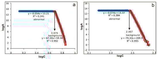 (a) Log–log plot of C–A fractal model of copper element; (b) log–log plot of C–A fractal model of porphyry copper mineral combination elements.
