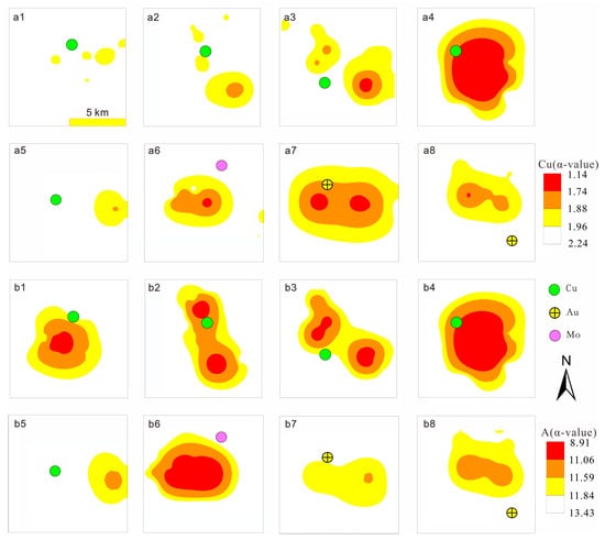 Geochemical anomaly map of typical deposits in western Gangdese. (a1–a8) Singular anomalies of copper elements of Zhu nuo, Jianglaang-zong, Balazha, Ri a, She suo, Tuan jie, Sa ka, and Ri na; (b1–b8) Singular anomalies of association elements of Zhu nuo, Jianglaangzong, Balazha, Ri a, She suo, Tuan jie, Sa ka, and Ri na; porphyry Cu deposit: Zhu nuo, Jianglaangzong, and Balazha; skarn Cu deposit: Ri a and She suo; porphyry Mo deposit: Tuan jie; porphyry Au deposit: Sa ka and Ri na.