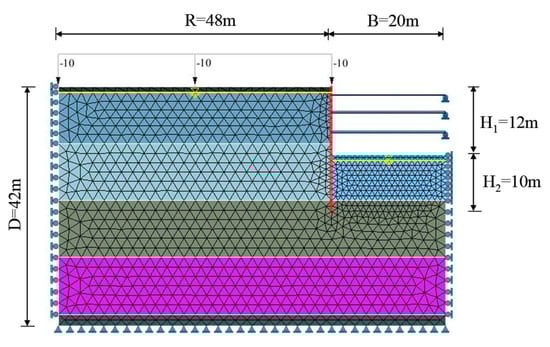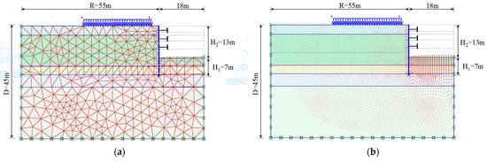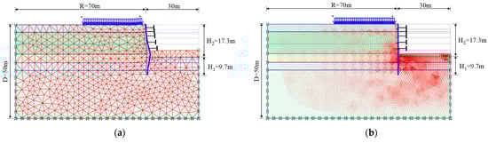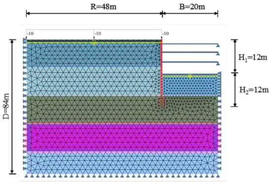 Similarly, some foreign scholars have applied the finite element method to analyze lateral displacements of retaining structures, yielding satisfactory results [,,,]. Recently, Maleki et al. also provided many important conclusions for reference in the field of numerical analysis modeling using the finite element method [,,].