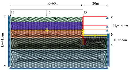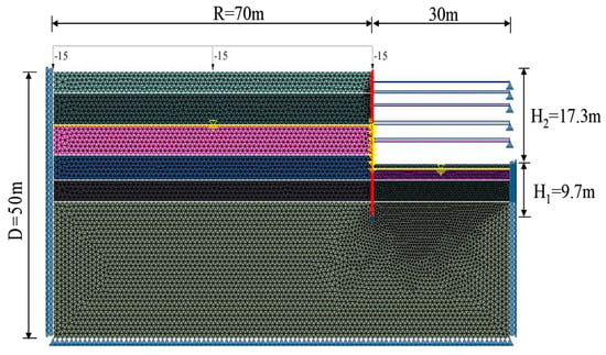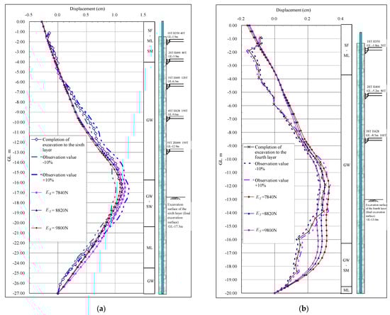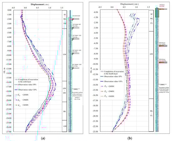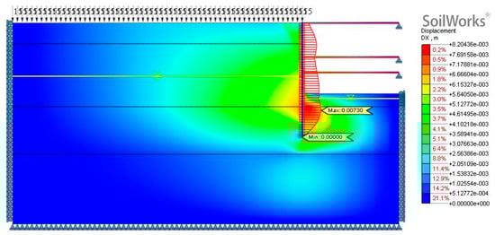 By accurately controlling the construction sequence during deep excavation analysis using the finite element method, it is possible to calculate the displacement of each mesh point within and outside the excavation area. Many domestic researchers have applied the finite element method to successfully obtain the lateral displacements of retaining structures [,,,,,].