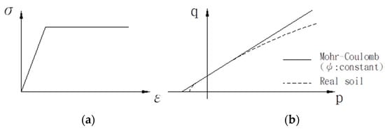 - Soil Parameters: In this study, the Mohr–Coulomb model, which is a built-in model within PLAXIS, was selected to simulate the soil behavior. The Mohr–Coulomb model is an elastic–perfectly plastic failure model based on elastoplastic theory. It considers factors such as the satisfaction of Hook’s Law during the elastic stage, yielding criteria, and the flow rule. The soil parameters required for this model are explained as follows: