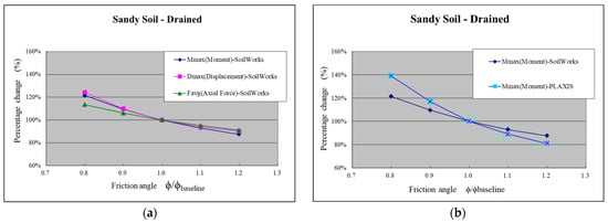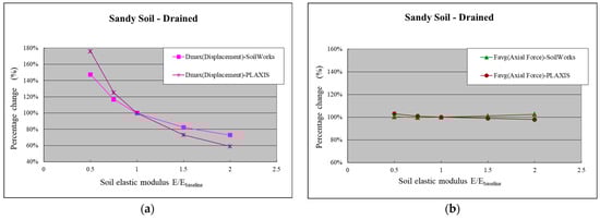 Chiu performed a sensitivity analysis using the PLAXIS program, specifically focusing on the effective friction angle and soil elastic modulus []. The results show that a smaller Φ value had a greater impact on the continuous wall bending moment, displacement, and average axial force. The undrained cohesive soil exhibited relatively lower sensitivity to the friction angle. The sensitivity of the average axial force was lower compared to the continuous wall bending moment and displacement. Regarding the sensitivity of the soil elastic modulus, a smaller Es value had a greater impact on the continuous wall displacement.