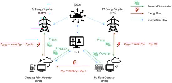 In such a configuration, the local DSO is responsible for the virtual dispatch (“virtual” because the dispatch is performed in front of the meter); the DSO measures and from the power meters of the EV charging point and the PV plants, respectively. The meters are read at a frequency that depends on the market time step whose value depends on countries. The DSO computes , based on the following logics and transfers these values to the LP, ESPV and ESEV, respectively.