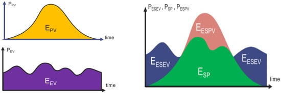 - The PVO injects in the network the power , if any, produced by the PV plant but not consumed by the EVS (i.e., such as ). The PVO sells the associated energy, represented in pink and noted EESPV, to the power supplier ESPV at a price .