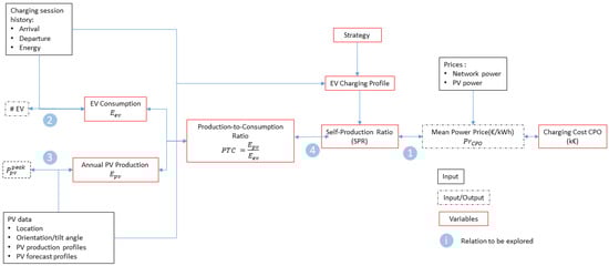 Furthermore, the computational logic of the proposed methodology can be split into four main relationships between input data and internal variables (defined in Section 3.3). Obtaining relationship 4, which relates the self-production ratio and the Production-to-Consumption ratio, is a rather complex task; the designer has to (1) collect and process input data (that are mainly the EV demand and the PV production and forecast), (2) perform simulations and (3) aggregate all the simulations results. Relationship 1 relates the price of the energy and the self-production rate. This relationship may be quite easily adapted to all the business models that aim at increasing this self-production rate. At last, relationships 2 and 3 are quite easy to compute. Thus: