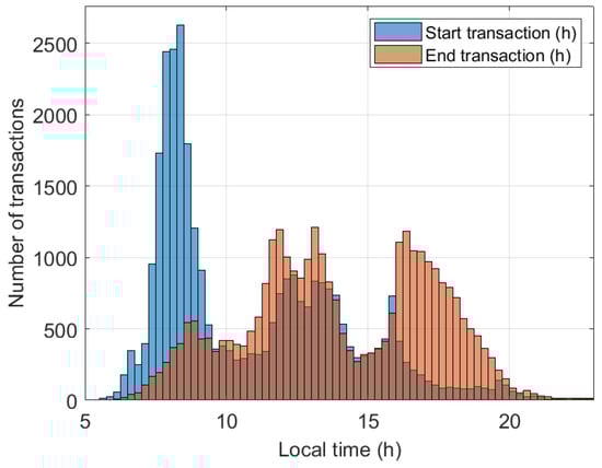 The row name of Table 3 represents the targeted outputs, while the columns are the input data. For example, in order to calculate the peak power of a PV plant (first line of the table), 8 out of 9 inputs (marked with an X symbol) must be collected. The CPO has to provide the price of the power from the network () and from the PV plant (); he also needs its target of Mean Power price (), obtain data about potential PV production (location of the plant, orientation, tilt angle and possibly PV production and forecast profiles), the expected number of EVs and their main characteristics (size and efficiency of the embedded charger, capacity of the battery, etc.). He also needs a charging session history that contains, for each session, the start date and the end date of the session. This history also has to contain the energy withdrawn by the car during each session. The history also has to record the name of the charging point and the user’s badge number. Lastly, the CPO has to obtain the relationship between a badge and the EV model.