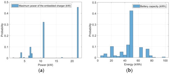 The work in [23] presents a methodology for sizing different energetic components of a PVCS in the microgrid context, including the size of the PV system, the stationary battery systems and the transformer. Theses sizes and other operational constraints are part of the objective function of an optimization algorithm that aims to minimize the entire system’s economic costs. The EVs’ initial SOCs are assumed to follow Gaussian distribution within the range of 0.2 and 0.5. The EVs’ battery capacities, number of daily EVs and arrival time are also synthesized using Gaussian distributions. The paper concluded that with this methodology, the cost of the optimally sized configuration without PV would be higher than that of an optimal configuration with PV installation. In one of their numerical examples, they consider a charging station made of four chargers of 40 kW each, a 300 kWp plant, a 600 kWh battery and a 200 kW transformer.