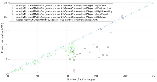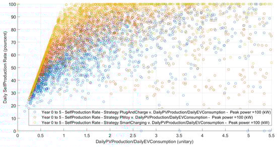 Based on the six defined periods in Table 4, we computed the SPR and PTC, resulting in six abacus diagrams shown below (Figure A3). Each sub-figure represents SPR versus PTC for the three strategies: Plug and Charge (blue), Mean Power (green), and Smart Charging (magenta). In the first period (June 2016 to May 2017), PTC ranges from 0 to 80; in the last period (from June 2021 to August 2022), PTC ranges from 0 to 15. This variation is due to similar PV production during both periods but a significant increase in EV consumption.