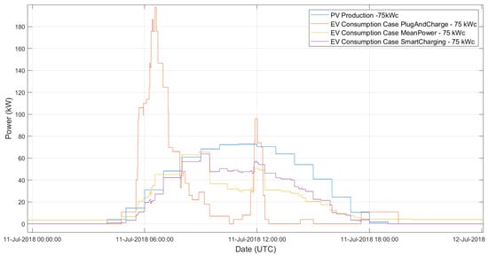 In [25], the authors study the integration of EV and PV in an office building located in southern Italy. In this study, one EV is charged during working hours. Four different charging needs are considered (from 0 km per day to 120 km per day). They also compare two charging modes: the first one is an AC charge without control, and the second one is a DC charge with control such that the EV consumes the surplus of the PV production. The authors compute the self-consumption and self-production rates obtained for four different values of PV peak powers (from 4.5 kWp to 9 kWp) for the two charging modes and for different sizes of charging points.