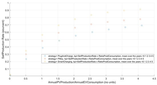 Production-to-Consumption (PTC) Ratio as a Function of Self Production Rate (SPR) for the 6-year period and for the three strategies.