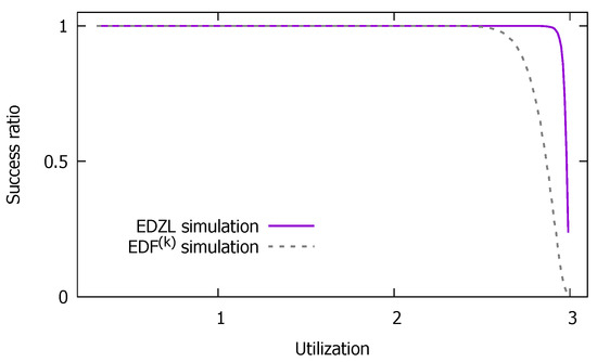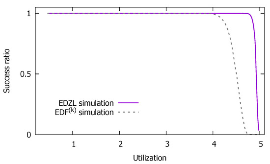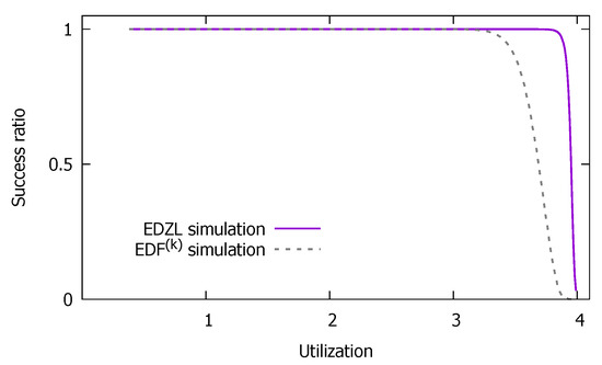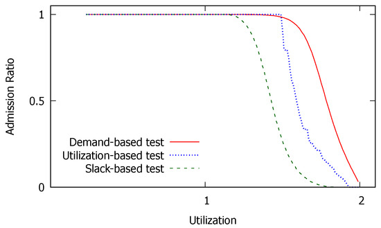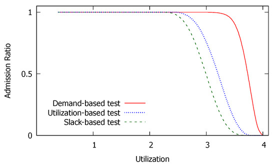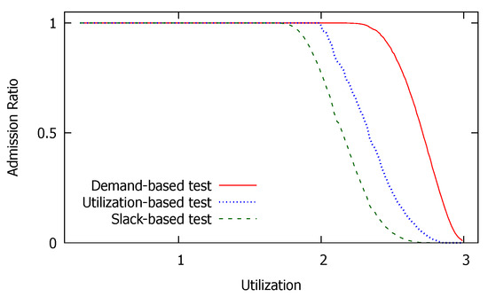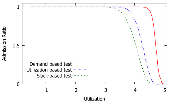 Figure 1, Figure 2, Figure 3 and Figure 4 show the admission ratio of each EDZL schedulability tests when , respectively. Low-utilization task sets are admitted by all the three tests. Most task sets with utilization less than are admitted by all tests. This value is close to the Piao’s schedulable utilization bound, . However, as the task set utilization increases, the number of admitted task sets decreases and so does the ratio. When the task set utilization approaches m, the ratio decreases sharply. In all cases, the demand-based test admits high-utilization task sets better than others. The ratio of the demand-based test begins to decrease at a utilization much higher than other tests. The demand-based test outperforms other tests.