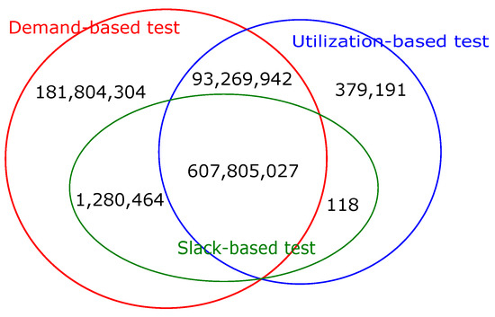 Figure 5 shows the number of test instances admitted by each test and their intersections. The number of test instances admitted by the demand-based test is 884,159,737 (=181,804,304 + 93,269,942 + 1,280,464 + 607,805,027). The number of test instances admitted by the utilization-based test is 701,454,278 (=379,191 + 93,269,942 + 118 + 607,805,027). The number of test instances admitted by the slack-based test is 609,085,609 (=1,280,464 + 607,805,027 + 118).