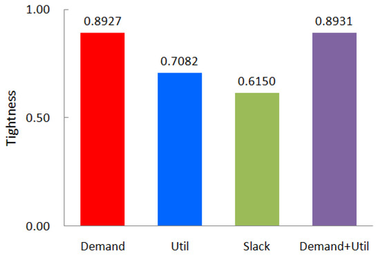 The tightness is a function of the set of test instances. If a different set of test instances is given, the set of schedulable test instances will be different, and thus the tightness of the same schedulability test will be different. Hence, we can employ tightness to compare the performance of schedulability tests for the same set of test instances. Furthermore, the tightness cannot be used to compare the schedulability test of different scheduling algorithms because the sets of schedulable test instances are different for the different scheduling algorithms. Note that a higher tightness does not imply dominance.