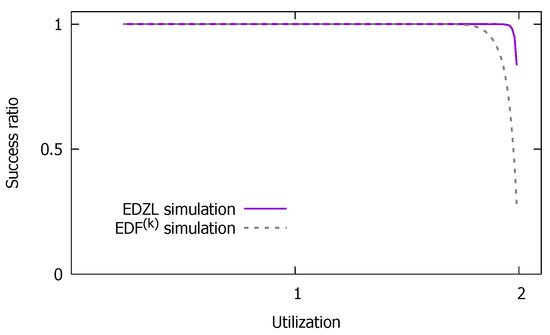 One of the ways to overcome Dhall’s effect is assigning high priority to high-utilization tasks to give them more chance to execute. EDF-variant algorithms such as EDF-US[], fpEDF, and EDF were developed to adopt this policy. EDF-US[] [30] assigns the highest priority to tasks with utilization greater than and assigns a normal priority to the remaining tasks based on EDF. EDF-US[] can successfully schedule any task set whose total utilization is less than or equal to . fpEDF [31] gives the highest priority to, at most, largest-utilization tasks with a utilization greater than . The remaining tasks are also given a normal priority based on EDF. fpEDF can successfully schedule any task set whose total utilization is less than or equal to . EDF gives the highest priority to () largest-utilization tasks and the remaining tasks are given a normal priority based on EDF. The schedulability of EDF is discussed in Section 2.4. Since EDF dominates EDF-US[] and fpEDF, as we will show in Section 2.4, it is sufficient to consider the schedulability of EDF.