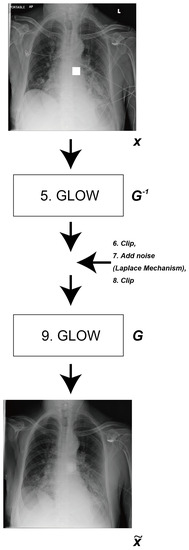 We prepare the vector function by training one of the flow-based DGMs, i.e., GLOW, with many CXR images prior to executing this locally differential private algorithm. We summarize our DP-GLOW algorithm to generate -LDP images below: