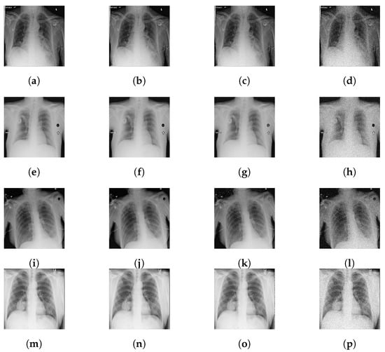 -LDP-processed CXR images obtained with DP-GLOW. (a) Original, case 1; (b) , case 1; (c) , case 1; (d) , case 1; (e) Original, case 2; (f) , case 2; (g) , case 2; (h) ,case 2; (i) Original, case 3; (j) , case 3; (k) , case 3; (l) , case 3; (m) Original, case 4; (n) , case 4; (o) , case 4; (p) , case 4.