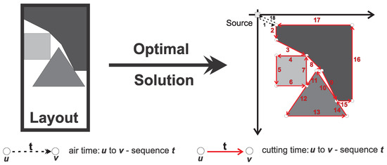 One approach for solving CPD problems is to use linear integer models to determine the optimal sequence of actions that minimizes the overall cutting time for a given set of parts [30]. Building on this, Dewil et al. [10] further extended the work presented in [30] by incorporating additional constraints that reflect real-world conditions. For instance, the relationships between inner and outer contours arise from holes in parts, pieces positioned within holes, or elements nested within enclosed waste areas. Considering the inner–outer contour relationship means an inner contour must be cut entirely before the outer shape is cut.