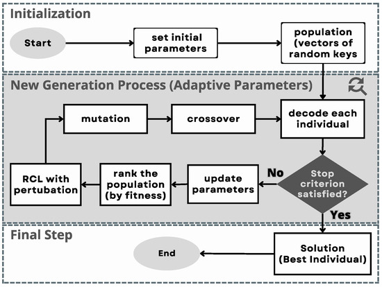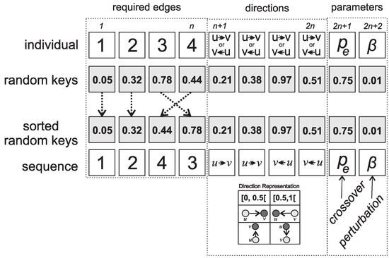 The biased random-key genetic algorithm (BRKGA), put forward by Goncalves and Resende [35], presents an evolutionary algorithm that streamlines several choices mentioned above. It relies on the notion of random keys to depict a solution and employs a decoder function to transform the random-key solution into an optimized solution for the problem. Consequently, developers must implement the problem-specific decoder and adjust the method’s parameters.